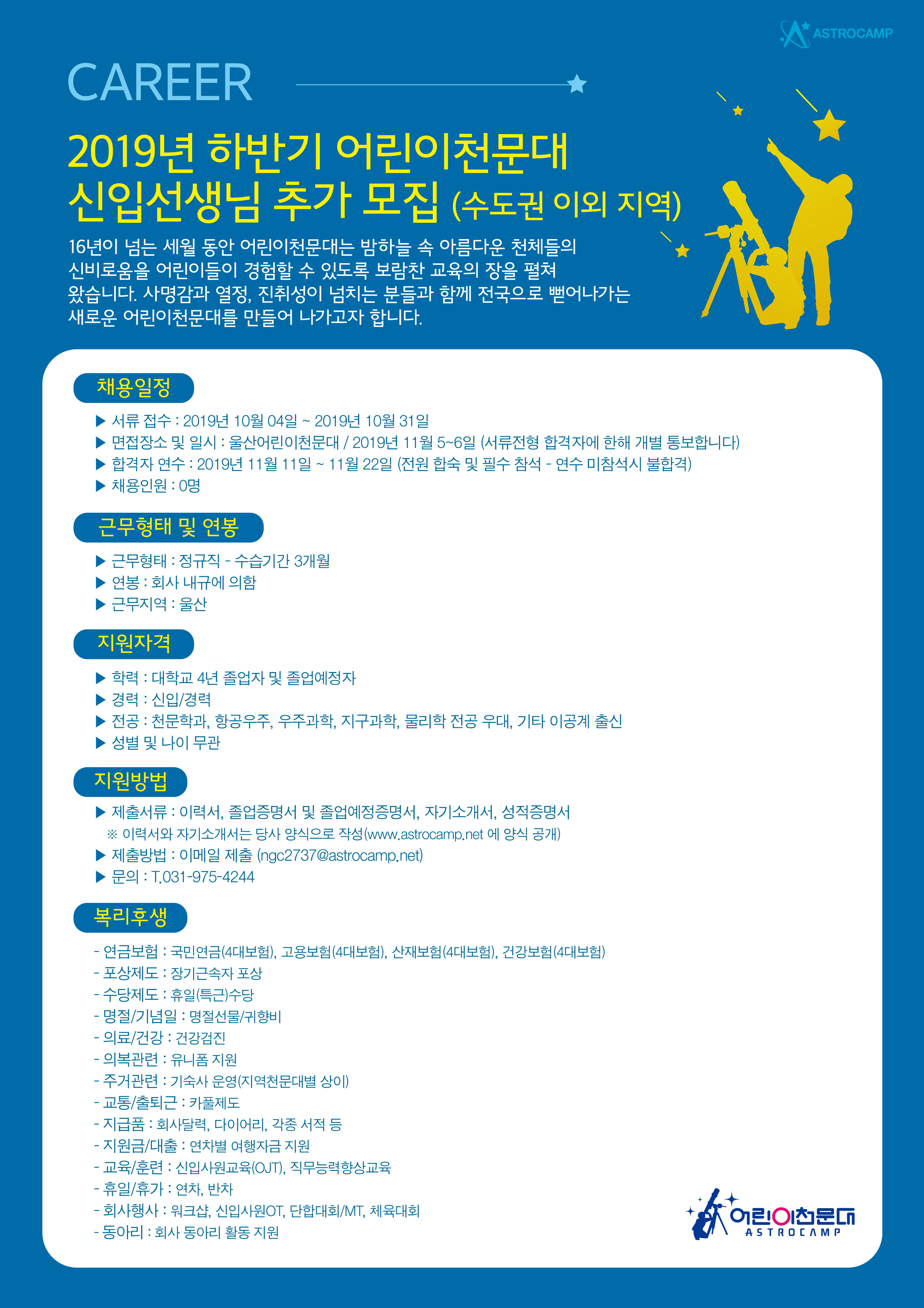 어린이천문대에서 2019년 하반기 신입선생님을 모집합니다. 열정과 진취성이 뛰어난 분들의 많은 관심 부탁드립니다.