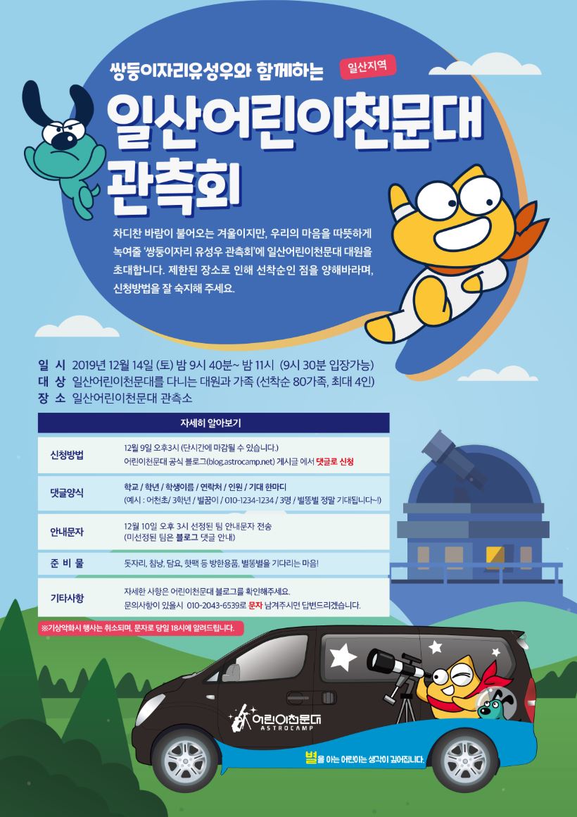 안녕하세요~ 일산어린이천문대입니다! 2019년 12월 14일 토요일 밤에 있을 쌍둥이자리 유성우에 일산어린이천문대 가족분들을 초대합니다 본 행사는 일산어린이천문대 대원들을 위해 진행됩니다 신청방법이 틀리면 접수가 되지 않으니 꼭! 위 링크를 통해 확인해주시기 바랍니다! |