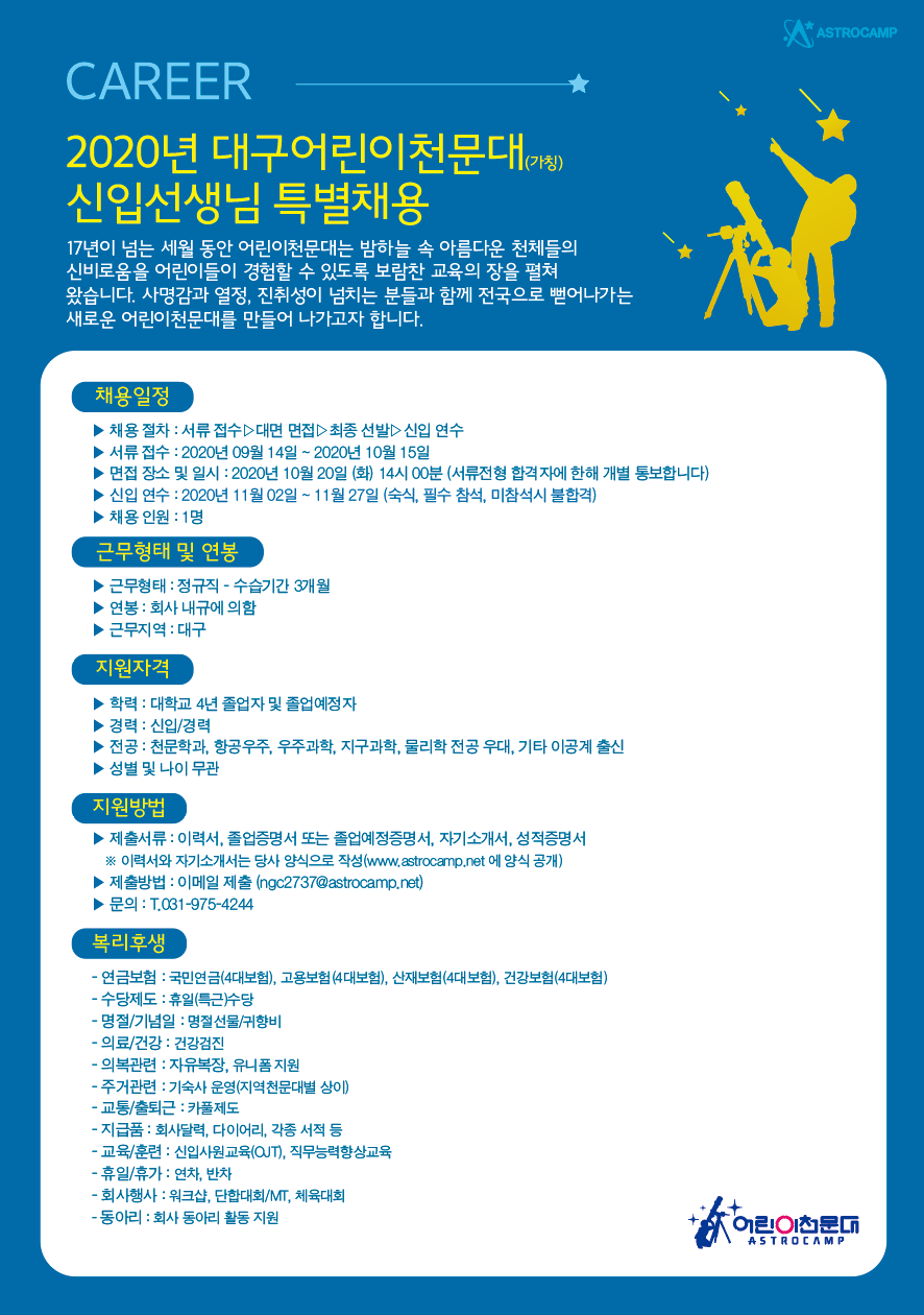 어린이천문대에서 2020년 하반기 신입선생님을 모집합니다. 열정과 진취성이 뛰어난 분들의 많은 관심 부탁드립니다.