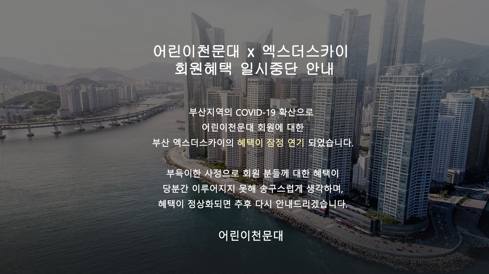 전국적으로 코로나-19가 확산 됨에 따라서 해운대 엘시티의 전망대, '엑스 더 스카이'에 대한 어린이천문대 회원 혜택이 당분간 중지 되었습니다.