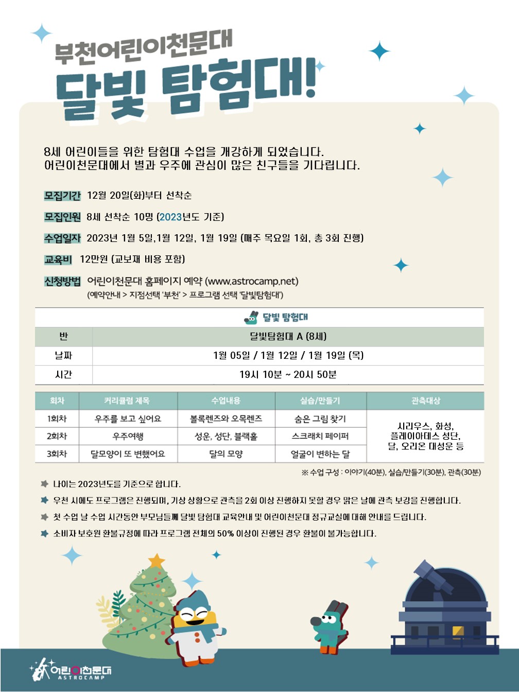 ※ 자세한 상담 및 문의는 부천어린이천문대 (032-677-3245)로 연락주시기 바랍니다. ※ 예약신청은 12월 15일(목) 19시부터 선착순으로 진행됩니다.