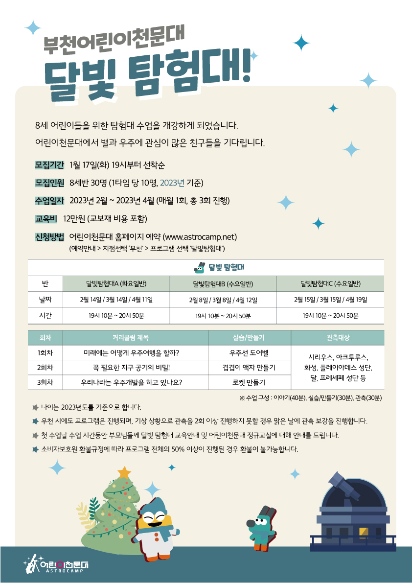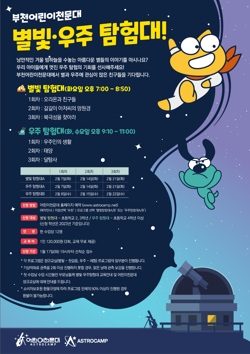 ※ 자세한 상담 및 문의는 부천어린이천문대 (032-677-3245)로 연락주시기 바랍니다. ※ 예약신청은 1월 17일(화) 19시부터 선착순으로 진행됩니다.