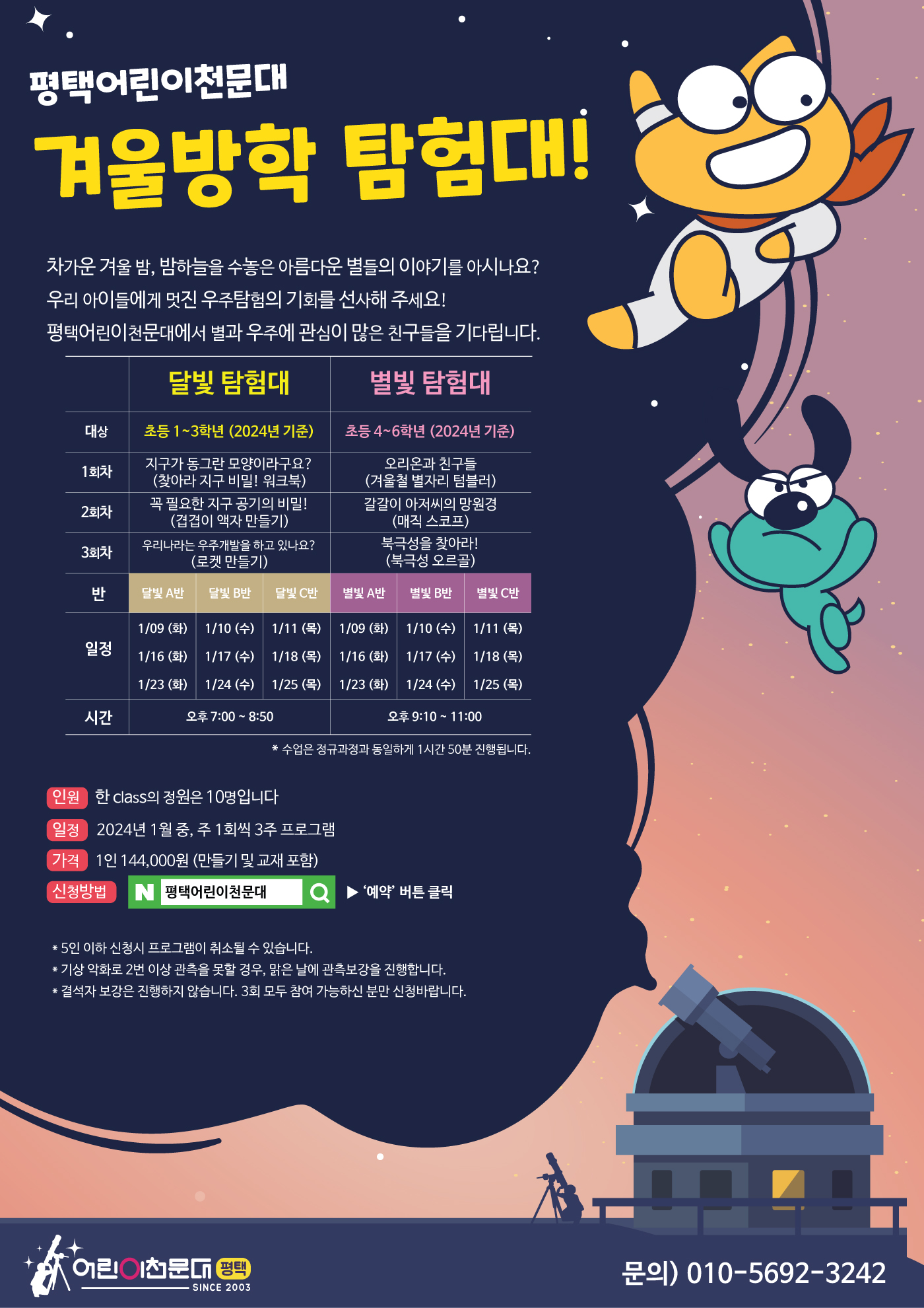 ※ 자세한 상담 및 문의는 평택어린이천문대 (010-5692-3242)로 연락주시기 바랍니다. ※ 예약신청은 선착순으로 진행됩니다.
