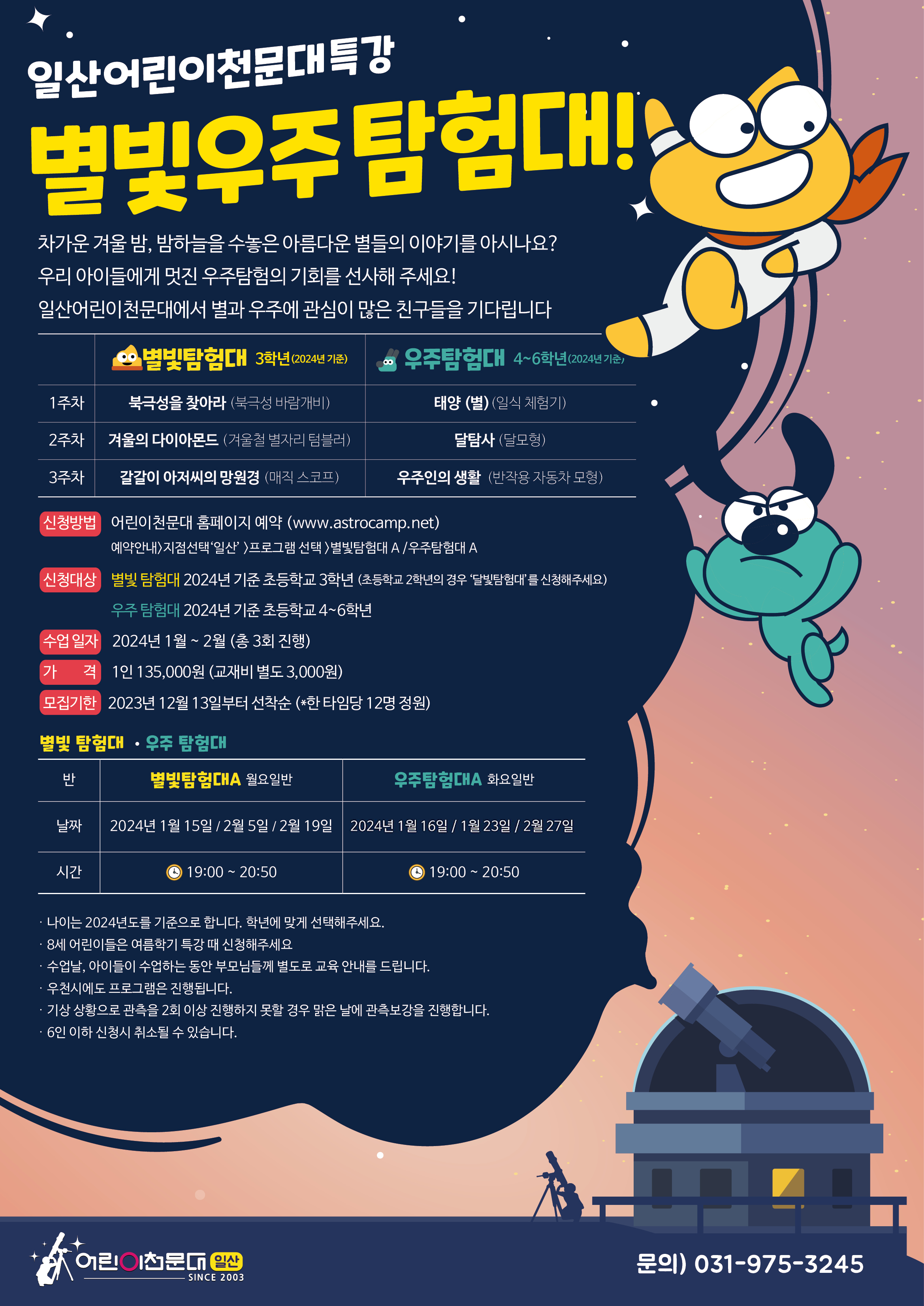 ※ 자세한 상담 및 문의는 일산어린이천문대 (031-975-3245)로 연락주시기 바랍니다. ※ 예약신청은 12월 13일부터 선착순으로 진행됩니다.