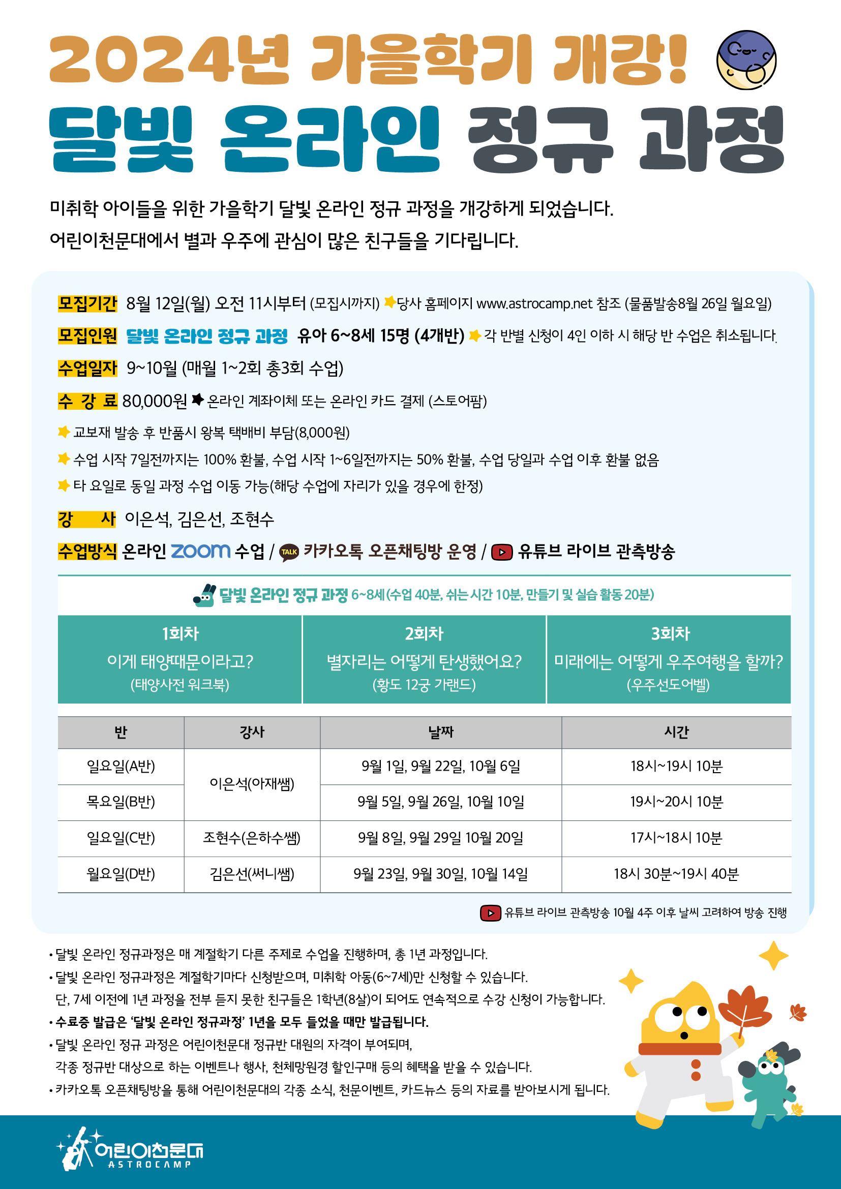 ※ 유튜브 라이브 관측방송 10월 4주 이후 날씨 고려하여 방송 진행 ※ C반 수업 일자가 최초 공지와는 다르게 변동되었습니다.