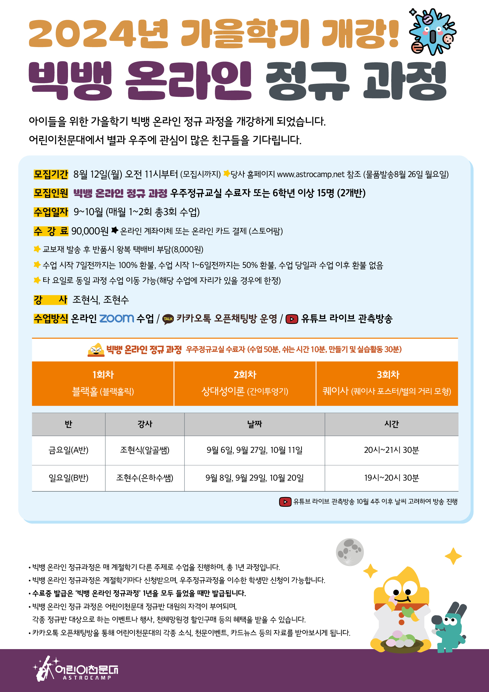 (초등 4~6학년, 우주 정규교실 수료자) ※ 유튜브 라이브 관측방송 10월 4주 이후 날씨 고려하여 방송 진행 ※ B반 수업 일자가 최초 공지와는 다르게 변동되었습니다.