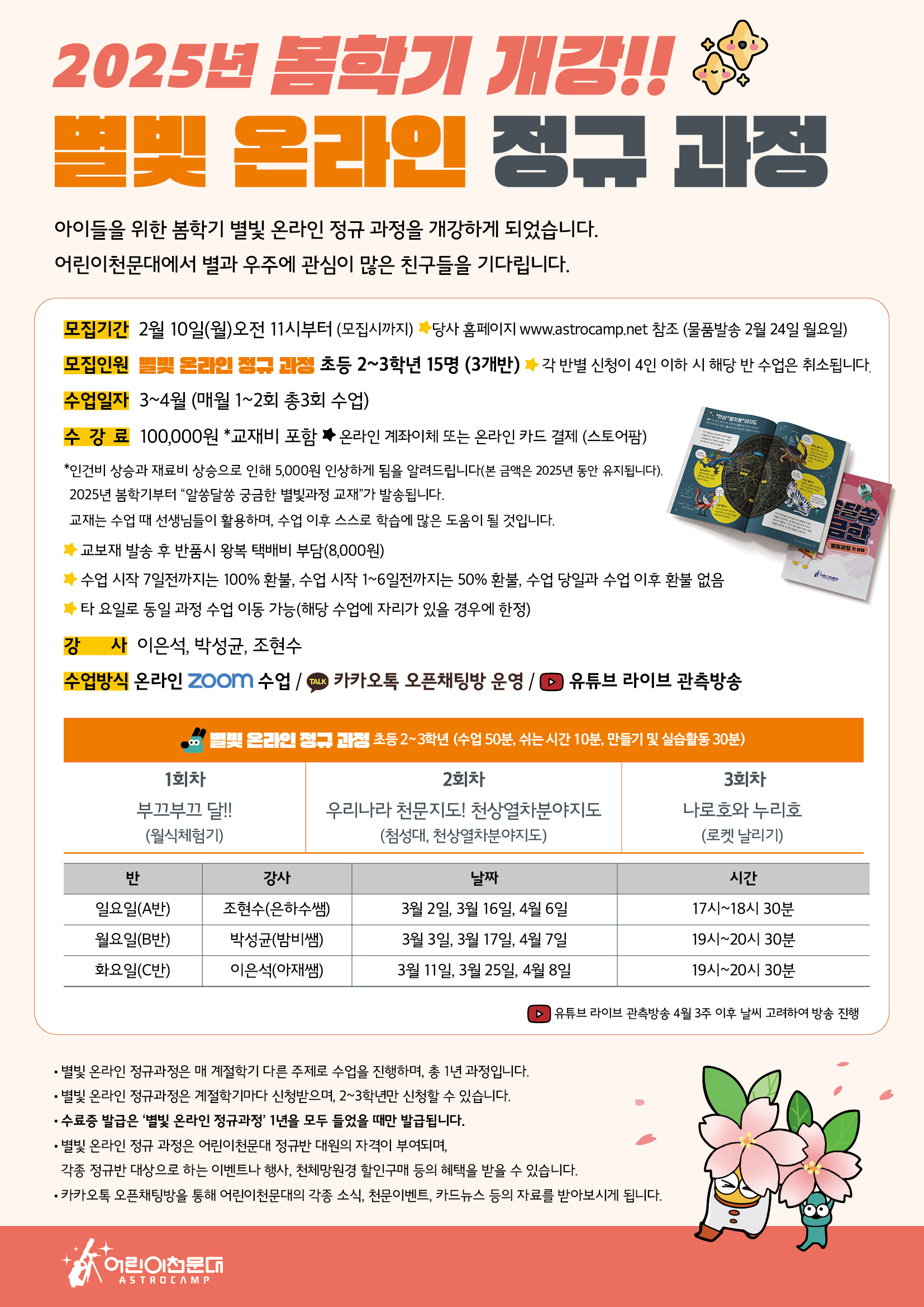※ 자세한 상담 및 문의는 어린이천문대 본사 (031-975-4244)로 연락주시기 바랍니다. ※ 신청은 2월 10일(월) 오전 11시부터 선착순으로 진행됩니다. ※ 물품발송은 2월 24일(월)에 일괄적으로 진행됩니다.