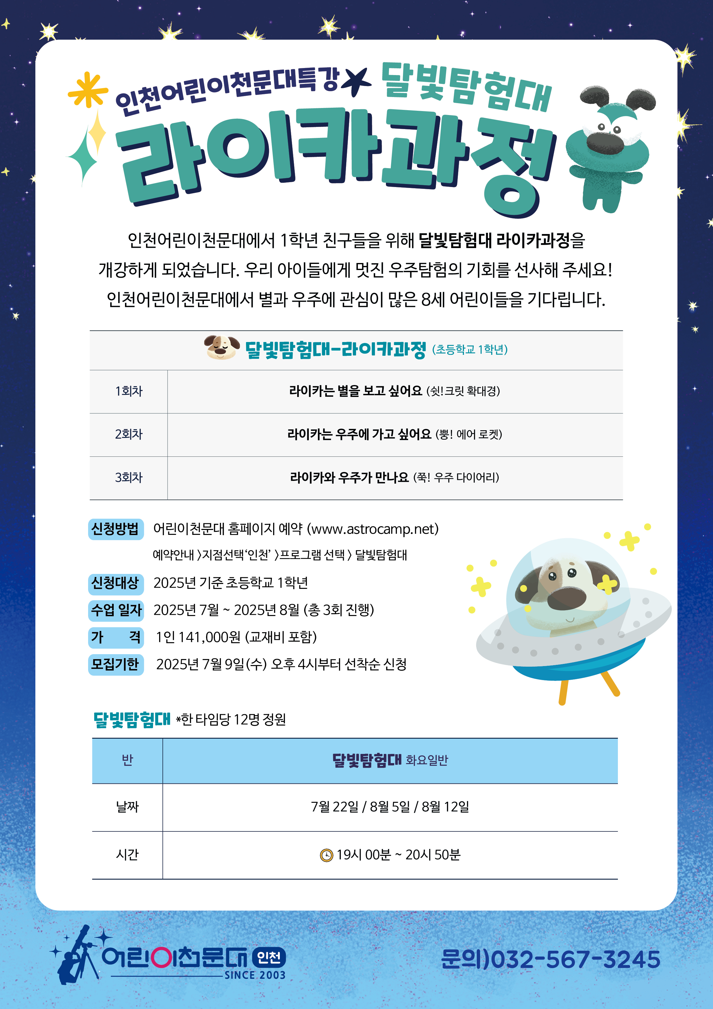 ※ 자세한 상담 및 문의는 인천어린이천문대 (032-567-3245)로 연락주시기 바랍니다. ※ 예약신청은 7월 9일부터 선착순으로 진행됩니다.
