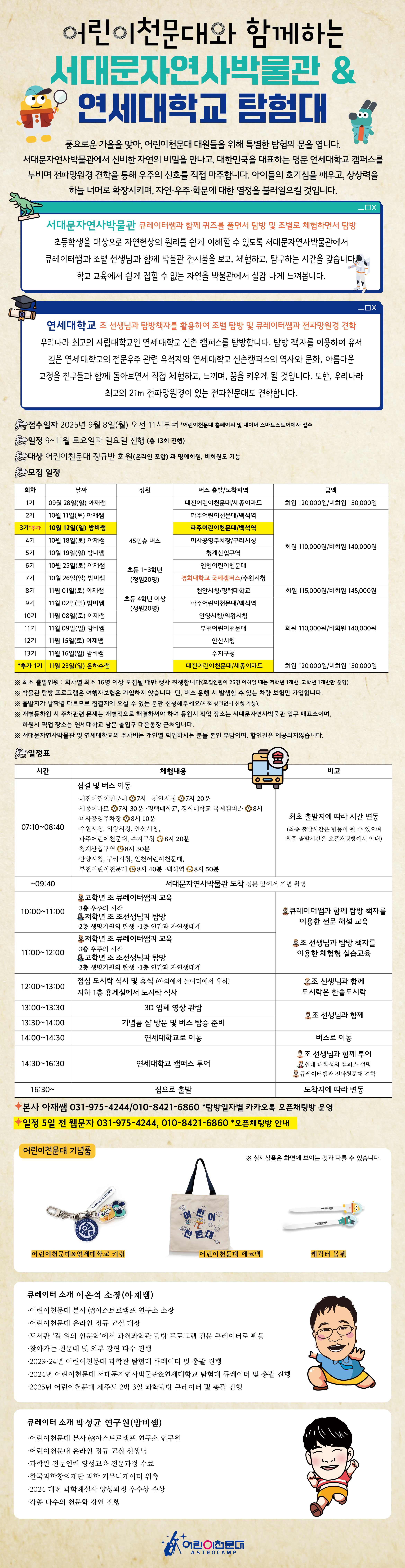 ※ 신청은 9월 8일(월) 오전 11시부터 선착순으로 진행됩니다.(11시 이전 신청자 접수 취소) ※ 탐방일자별 카카오톡 오픈채팅방이 운영 됩니다. (필수 참석) ※ 일자별 최소 16명 이상 모집될 때만 행사 진행됩니다. ※ 출발지가 날짜별 다르므로 집결지에 오실 수 있는 분만 신청해주세요.(지점 상관없이 신청 가능) ※ 개별등하원시 주차관련 문제는 개별적으로 해결하셔야 하며(주차비 개인 부담), 등원 장소는 서대문자연사박물관 입구 매표소이며 하원 장소는 연세대학교 남문 출입구 대운동장 근처입니다. ※ 1,2,3,4,7,8,9,10기는 버스 출발장소와 도착장소가 두 곳 입니다.