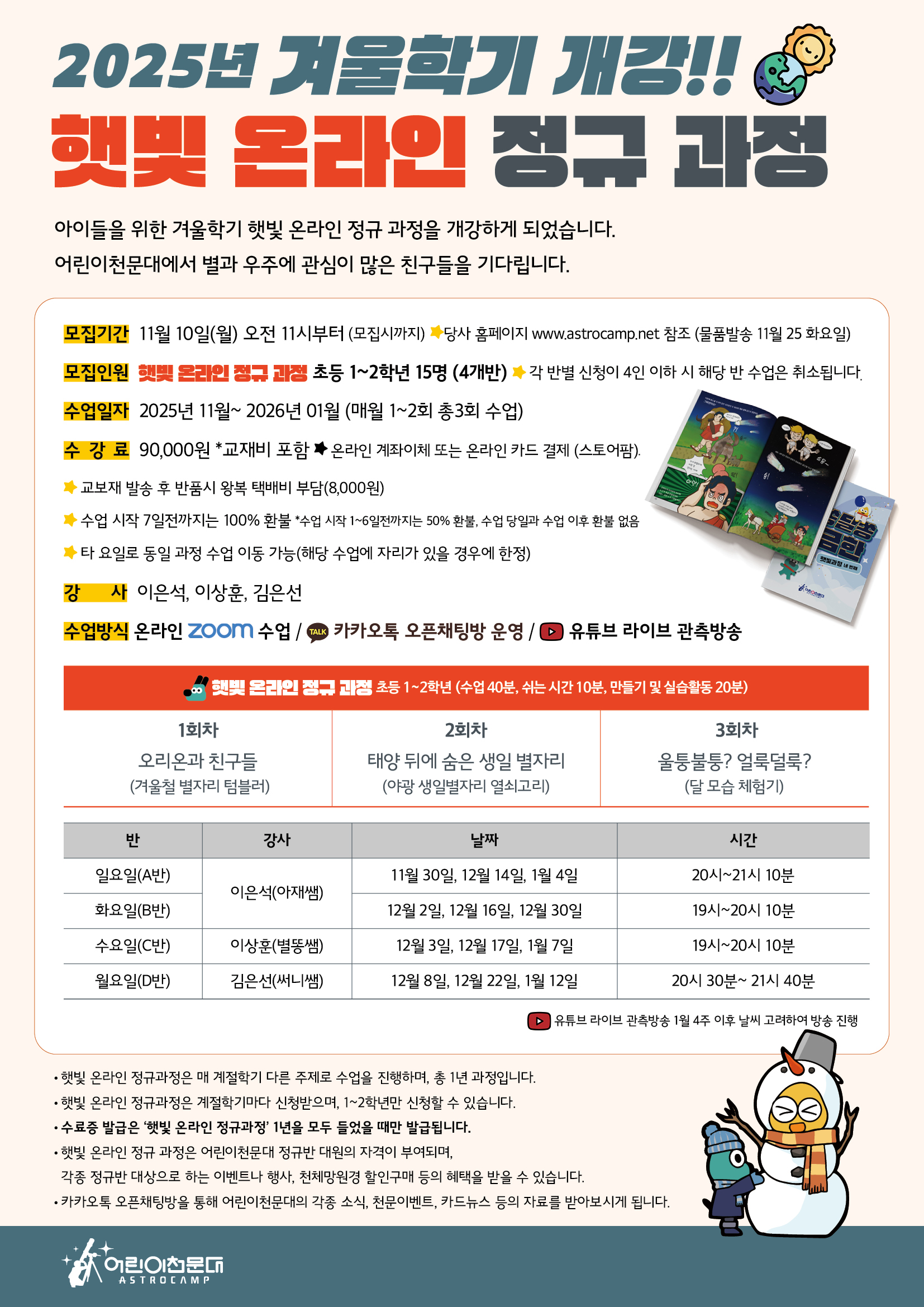 ※ 자세한 상담 및 문의는 어린이천문대 본사 (031-975-4244)로 연락주시기 바랍니다. ※ 신청은 11월 10일(월) 오전 11시부터 선착순으로 진행됩니다. ※ 물품발송은 11월 25일(화)에 일괄적으로 진행됩니다. ※ 유튜브 라이브 관측방송 26년 1월 4주 이후 날씨 고려하여 방송 진행