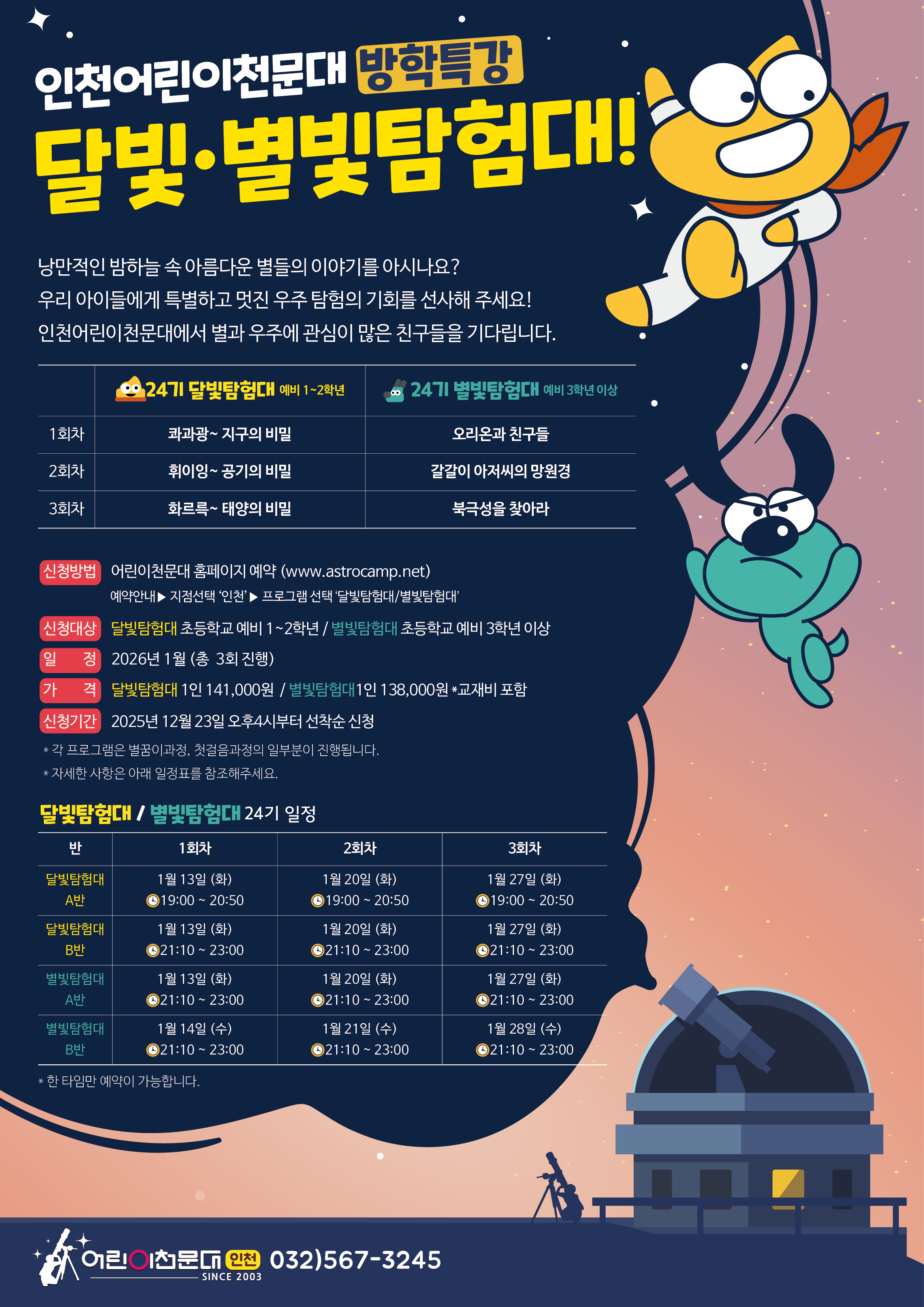 ※ 자세한 상담 및 문의는 인천어린이천문대 (032-567-3245)로 연락주시기 바랍니다. ※ 예약신청은 12월 23일 16시부터 선착순으로 진행됩니다.