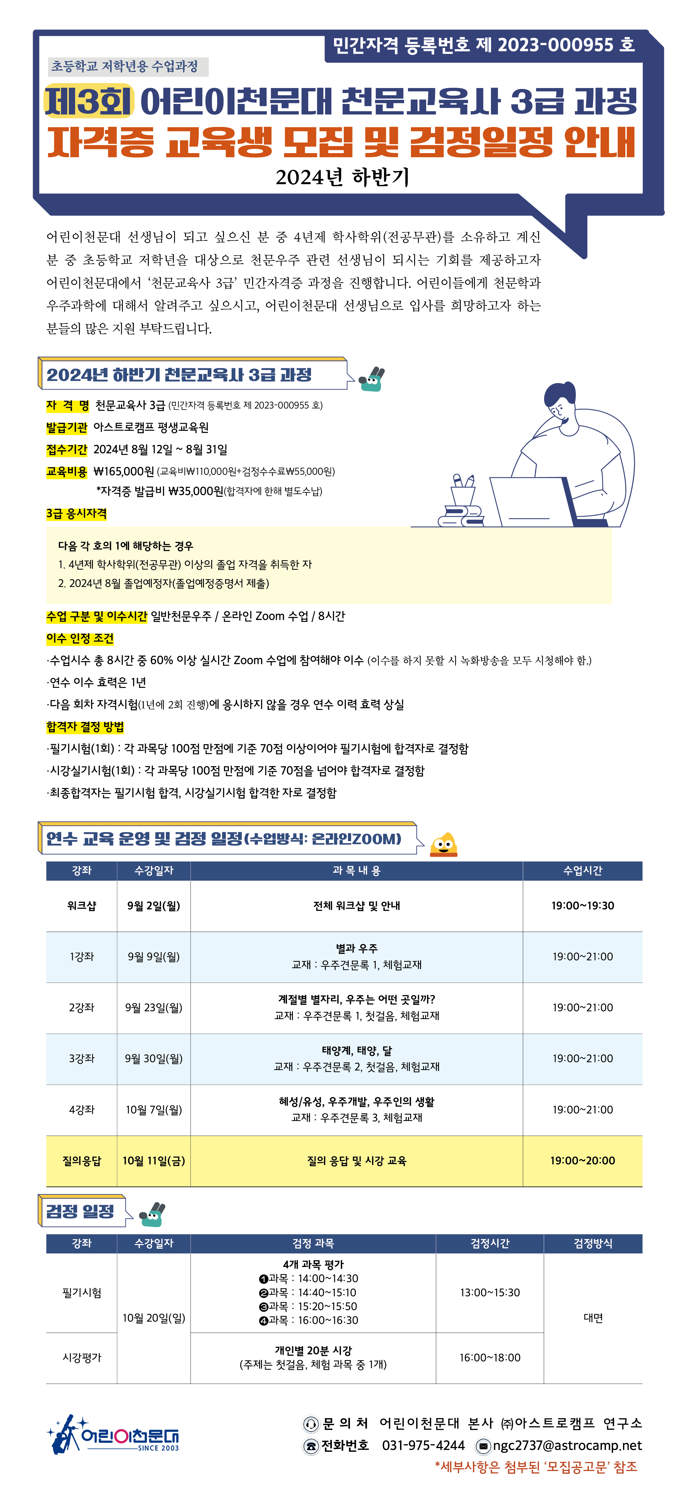 어린이천문대에서 2024년 천문교육교사 하반기 3급 과정 교육생을 모집합니다. 열정과 진취성이 뛰어난 분들의 많은 지원 바랍니다.
